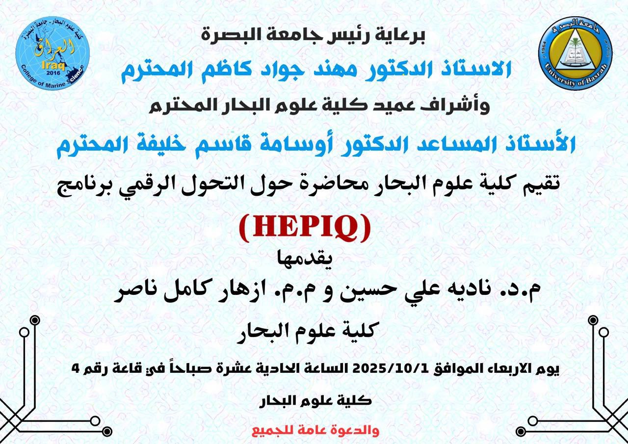 في خطوة تؤكد التزامها الراسخ بتطبيق معايير الجودة العالمية والتحول نحو الأتمتة الإدارية، أقامت كلية علوم البحار بجامعة البصرة محاضرة رقمية نوعية تناولت آليات الدخول والعمل على نظام HEPIQ (نظام إدارة معلومات التعليم العالي).