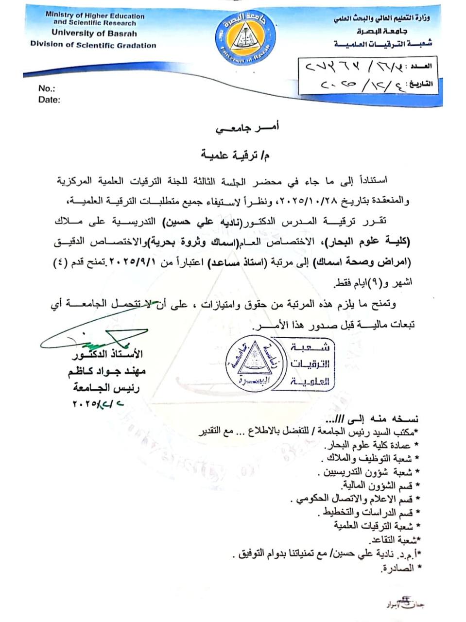 حصلت م.د. ناديه علي حسين، التدريسية في كلية علوم البحار - جامعة البصرة، على ترقية علمية إلى مرتبة (الأستاذ المساعد) بعد استكمال متطلبات الترقية المنصوص عليها في قانون الترقيات العلمية. وذلك استناداً إلى الأمر الجامعي الصادر عن جامعة البصرة ذي العدد (3/ 16/ 27363) بتاريخ 4/12/2025.