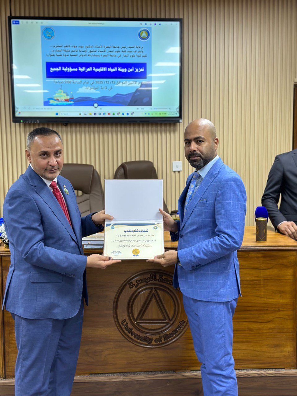 أُقيمت في كلية علوم البحار يوم الاثنين الموافق 2025/12/15 وباشراف عميد الكلية الدكتور اوسامة قاسم خليفة ندوة علمية بمشاركة عدد من الدوائر والمؤسسات ذات العلاقة بالجانب البحري، وتحت شعار ( تعزيز أمن وبيئة المياه الإقليمية مسؤولية الجميع)، شاركت في الندوة