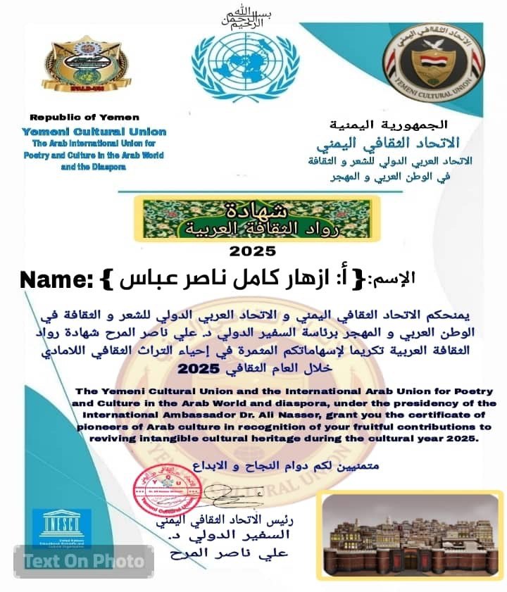 حازت المدرس المساعد أزهار كامل ناصر، التدريسية في كلية علوم البحار بجامعة البصرة، على شهادة تقدير من الاتحاد الثقافي اليمني والاتحاد العربي الدولي للشعر والثقافة في الوطن العربي والمهجر، برئاسة السفير الدولي د. علي ناصر. جاء هذا التكريم بمناسبة إعلان "شهادة رواد الثقافة العربية"، تقديراً لإسهاماتها المثمرة في إحياء التراث الثقافي اللامادي خلال العام الثقافي 2025.