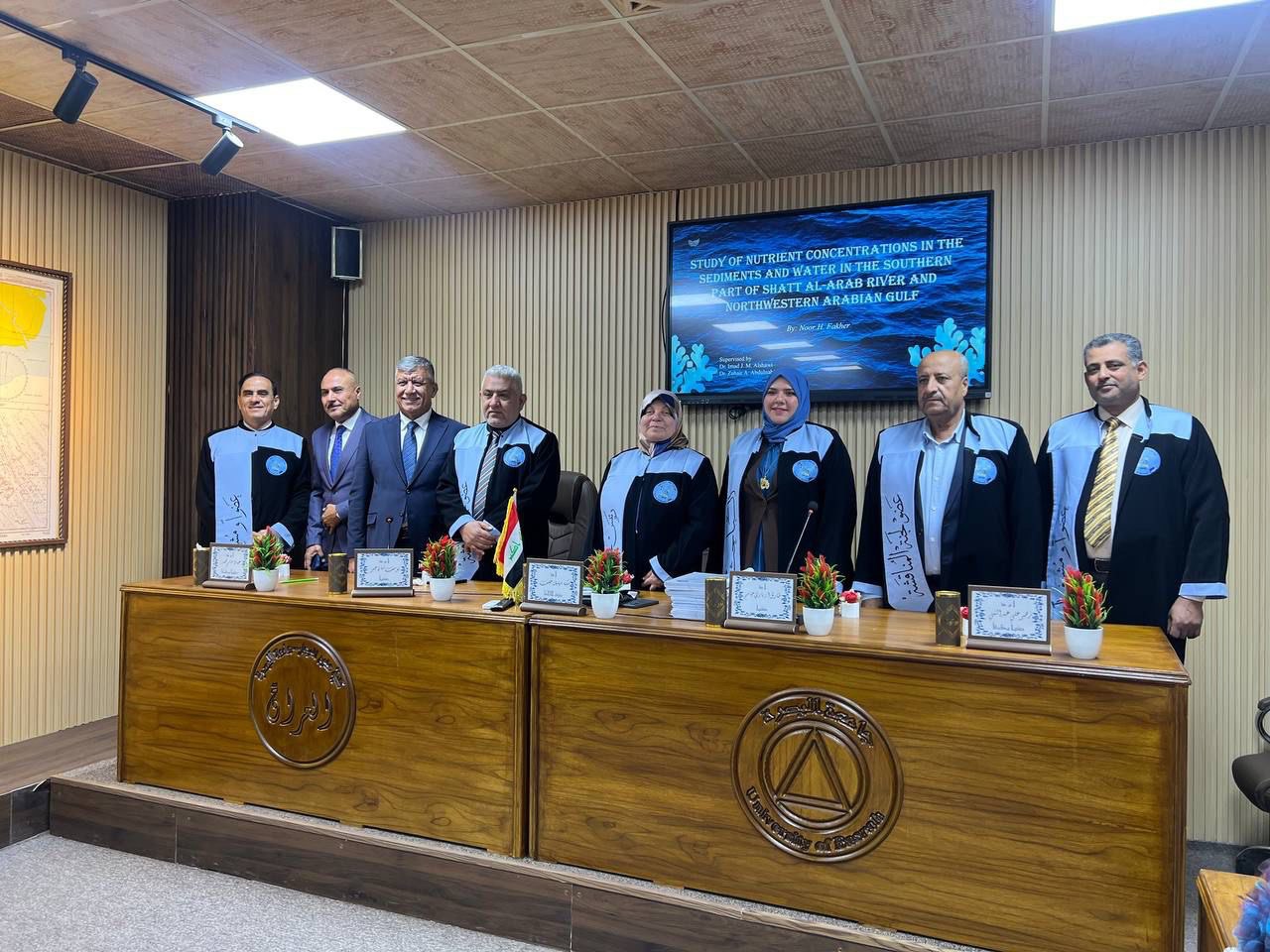 جرت بعون الله تعالى مناقشة طالبة الماجستير (نور حميد فاخر) في قسم علوم البحار التطبيقية عن رسالتها الموسومة بـ (دراسة تراكيز المغذيات في رواسب ومياه الجزء الجنوبي من مصب شط العرب وشمال غرب الخليج العربي) تحت إشراف كل من أ.د. عماد جاسم محمد وأ.م.د.زهير علي عبد النبي، وذلك في تمام الساعة التاسعة من صباح يوم الخميس الموافق 26/02/2026، في قاعة المؤتمرات والدراسات العليا في رحاب كلية علوم البحار.