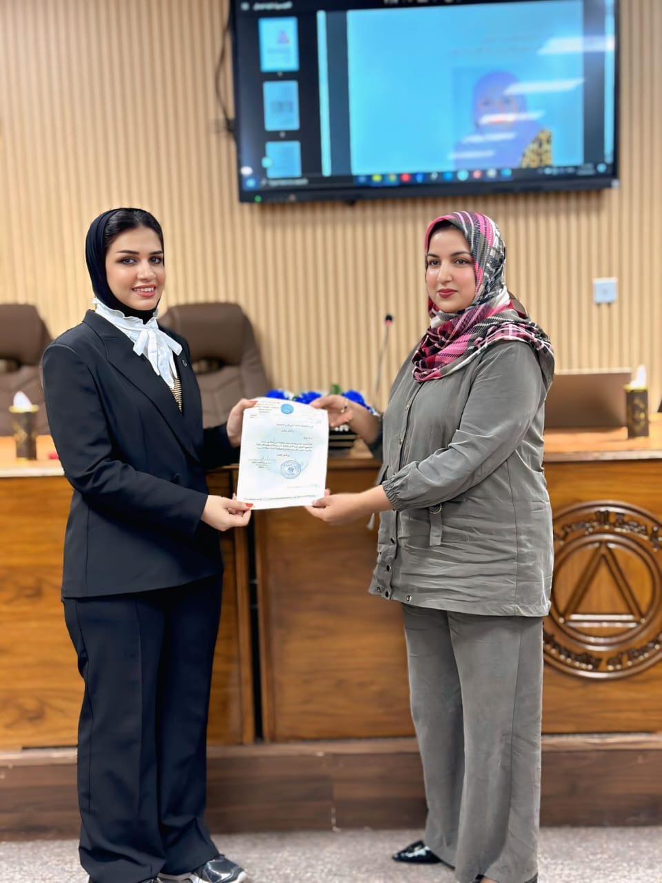 وفي ختام المحاضرتين، تم تكريم المحاضرات بشهادة تقديرية وكتاب شكر من قبل الدكتورة كاظمية جواد عبدالله، أمين مجلس الكلية ومسؤولة وحدة شؤون المرأة، والأستاذ المساعد الدكتور مؤيد حسن البهادلي، رئيس قسم علوم البحار التطبيقي، تقديراً لجهودهن القيمة في إثراء المجتمع الفكري ومعالجة قضايا حقوق المرأة.