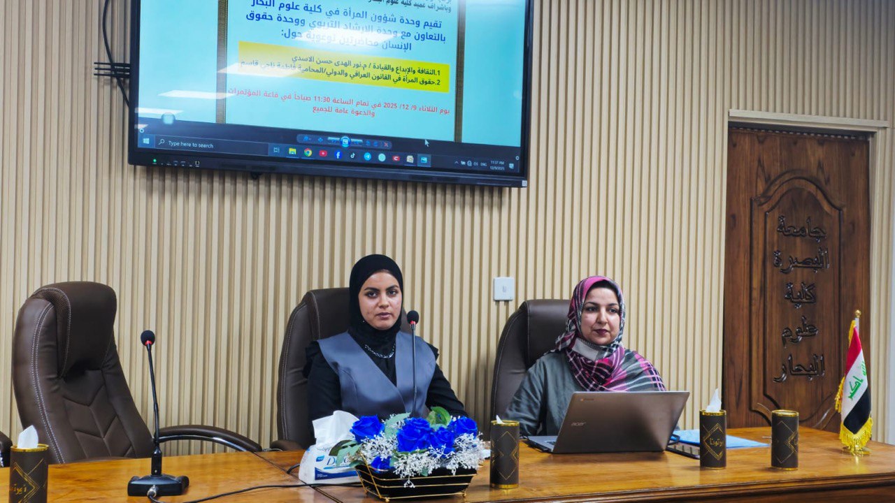 أقامت وحدة شؤون المرأة في كلية علوم البحار بالتعاون مع وحدة الإرشاد التربوي والتوجيه النفسي ووحدة حقوق الإنسان محاضرتين حول "الثقافة والإبداع والقيادة" و"حقوق المرأة في القانون العراقي والدولي" يوم الثلاثاء الموافق 9/12/2025 في قاعة المؤتمرات.